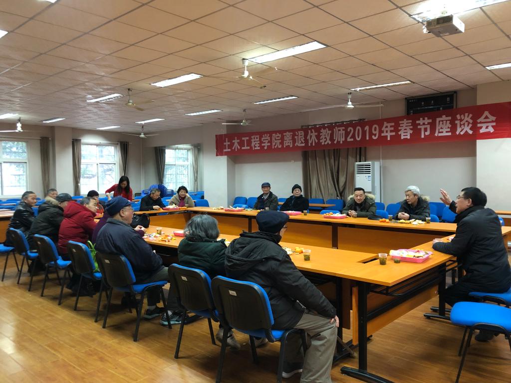 1月23日上午,土木学院在金盆岭校区2号教学楼二楼会议室举行离退休教师2019年春节座谈会,看望慰问离退休老同志,院长李传习出席。座谈会由院党委副书记、分工会主席王煜坤主持。