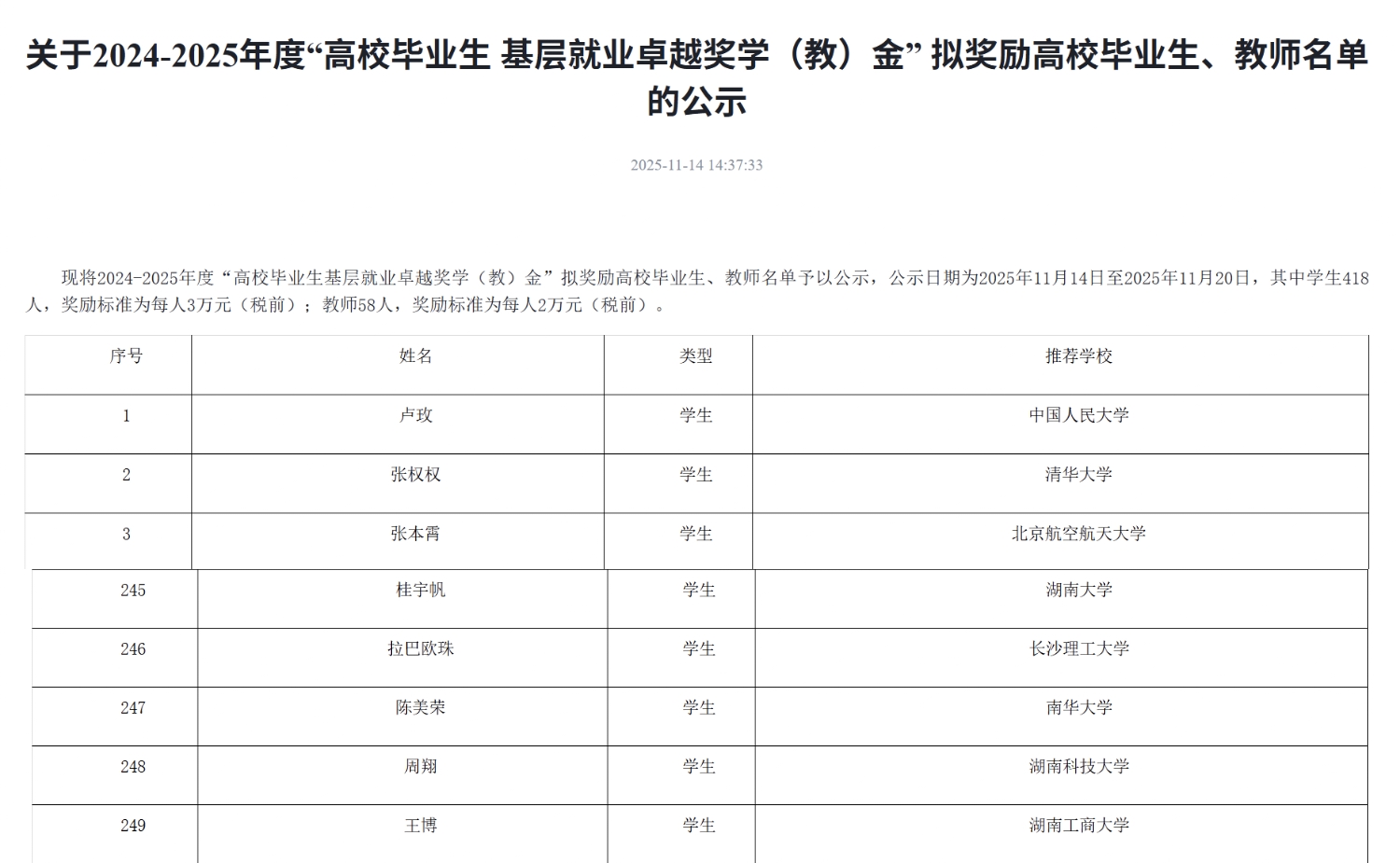 “高校毕业生基层就业卓越奖学(教)金”由教育部高校学生司(高校毕业生就业服务司)、教育部学生服务与素质发展中心共同指导,中国长江三峡集团有限公司出资,中国教育发展基金会特设,旨在贯彻落实党中央、国务院关于引导和鼓励高校毕业生到基层就业的决策部署,奖励赴基层就业并做出突出业绩的普通高校毕业生,以及普通高校指导服务大学生赴基层就业工作有突出贡献的教师。本年度全国共评选出“高校毕业生基层就业卓越奖学金”418人。