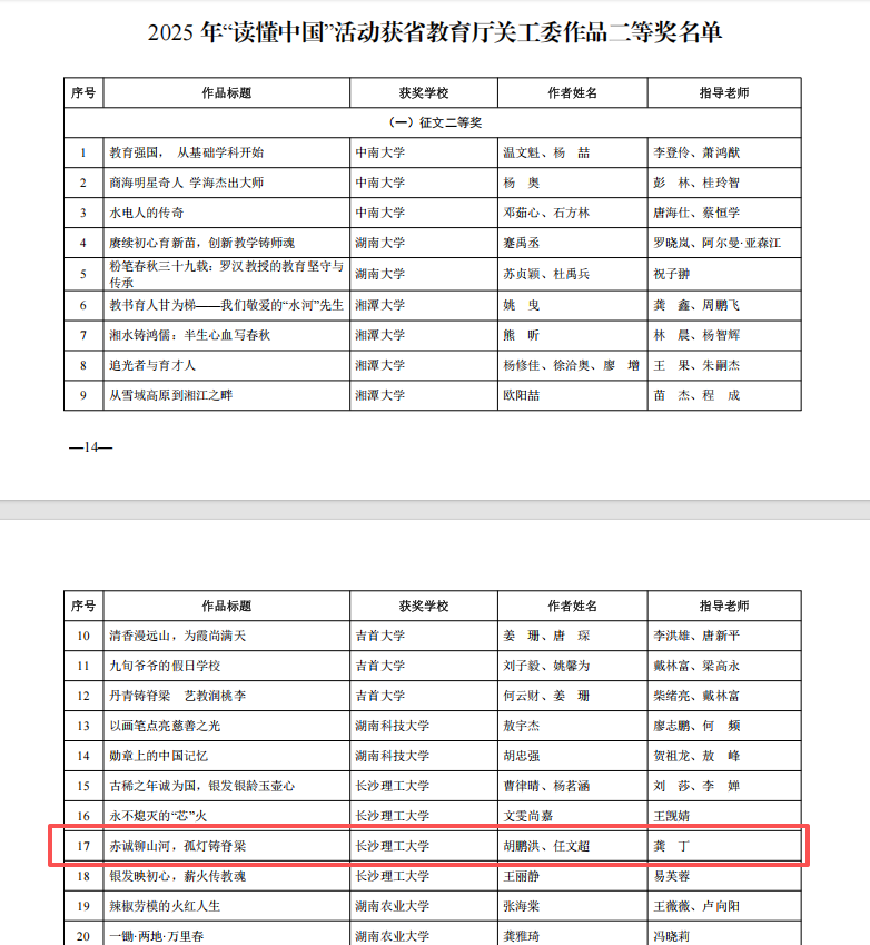 近日,教育部关工委与湖南省委教育工委相继公布2025年“读懂中国”主题教育活动作品评审结果。我院龚丁指导,胡鹏洪、任文超创作的《赤诚铆山河,孤灯铸脊梁》获评省教育厅关工委作品征文二等奖。