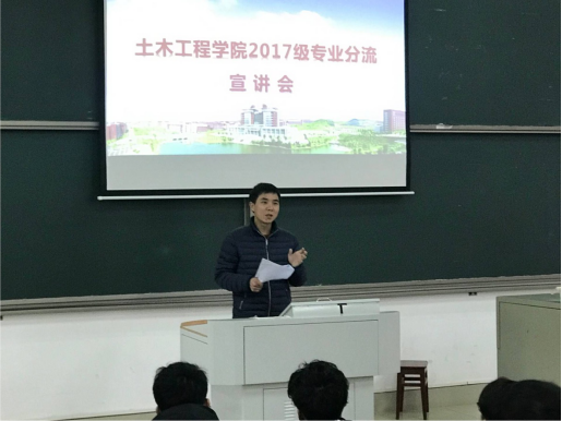 3月5日下午,土木学院在云塘校区综合教学楼B202教室和B302教室举行了土木类2017级专业分流宣讲会。院党委副书记王煜坤、副院长肖勇刚,学院各教学系专业老师陈卓异、黄阜、蒋志明、王中强、陈文胜应邀出席,2017级辅导员李小军及土木类全体本科生参加会议。