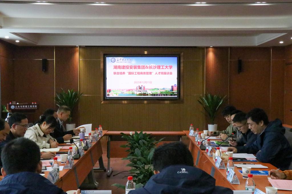 吴振华对唐学兵一行的到来表示欢迎,并介绍了学校及学院在人才培养、科研平台、师资队伍、就业创业等方面的建设情况及成效。唐学兵介绍了湖南安装的历史沿革、主营业务、战略布局与人才需求。随后,与会双方围绕“国际工程商务管理”人才班的实施方案、课程设置、师资配备、教学管理、实习实践及校企科研合作等内容深入研讨交流。
