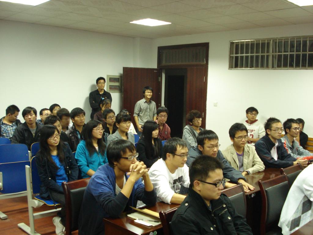 2011年11月3日19点,“拓新论坛”之土建学院研究生学术交流会在工科二号楼A502如期进行。会议邀请了研二以及研三的优秀研究生代表杨翠屏、张明、王文亭和侯攀,研一的大部分同学和少量本科生参加了此次交流会。