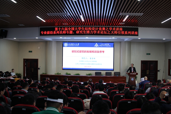 2023年10月29日,“'创新与实践'专家说”第十六届全国大学生结构设计竞赛之系列学术讲座(三)暨专业前沿系列名师专题、研究生博力学术论坛之大师引领系列讲座在云塘校区工科二号楼举行。太原理工大学雷宏刚教授应邀做了题为“装配式建筑的发展瓶颈与思考”的学术报告。报告由土木工程学院副院长陈伏彬教授主持,彭建新教授、张振浩教授、贺君教授及200余名教师、研究生和本科生聆听了报告。