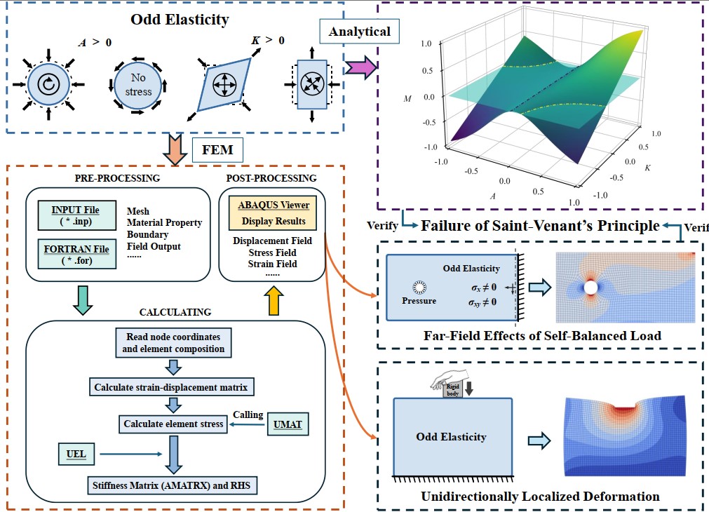 遵循经典弹性理论的研究范式,从微分方程边值问题的角度系统探讨了非厄米奇弹性问题。构建了奇弹性固体力学的解析理论与有限元方法相结合的统一分析框架。研究揭示了奇弹性固体在外部载荷下的变形与应力分布的手性特征,并进一步阐明了圣维南原理在非厄米力学系统中的失效机制,为非厄米系统的理论与数值分析提供了系统化的研究路径(图1)。