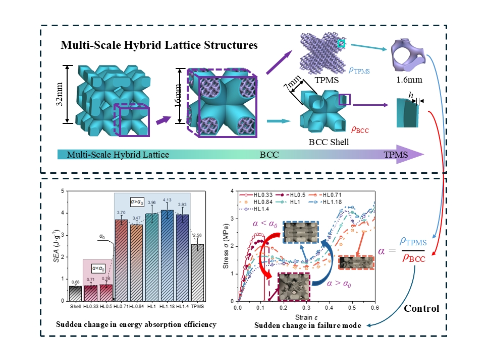 基于选择性激光熔融(SLM)金属3D打印技术设计了多尺度混合晶格,并对其力学性能进行了研究。结果表明,结构的破坏对壳体的填充体积分数高度敏感。通过参数调控,结构可实现由宏观整体破坏向稳定分层破坏转变,并在临界参数附近表现出突发式能量吸收增强行为。相关成果可为兼具韧性与能量吸收的超材料设计、制备提供了思路(图3)。