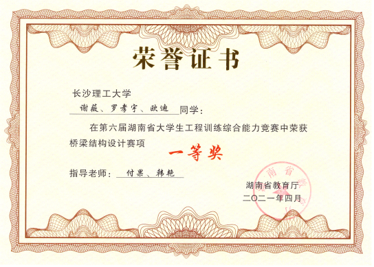 获第六届湖南省大学生工程训练综合能力竞赛一等奖2项(桥梁设计项目冠亚军)