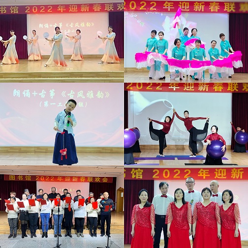随着第三工会小组的大合唱《歌唱中国》大气登场,2022年图书馆迎新春联欢会拉开帷幕。各工会小组精心表演了合唱、朗诵、舞蹈等节目,间以各种游戏与抽奖环节,现场精彩纷呈,笑声此起彼伏。其中,第一工会小组的古筝朗诵《古风雅韵》雍容典雅;第二工会小组的大合唱《我的中国心》气势磅礴;第三工会小组的舞蹈《南水湖之恋》仙姿缥缈;第四工会小组的朗诵《致青春》催人奋进;图书馆瑜伽组的舞蹈《你来的正是时候》更是轻灵舒缓而又充满力量,赢得观众阵阵热烈掌声。朗诵《再忆海棠,纸短情长》、舞蹈《福字最中国》、合唱《三套车》也博得满堂喝彩。此外,在联欢会上图书馆贴心地为今年退休的董丽等3位职工举行了荣退仪式并由新进员工献上祝福。在代代薪火相传中,图书馆事业必将生生不息、永葆青春。作为图书馆长期保留的文化建设精品项目,迎新春联欢会不仅展示了图书馆职工的文艺才华,也体现出图书馆人的高度自觉的团队意识和健康向上的精神面貌,有效增进了全体职工之间的感情。、