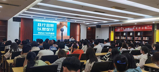 59日下午,图书馆在云影文化传播中心(云塘馆B-102)举办了第十期云影悦读讲坛,主题为且行且思、以思促行——我的27年声音路。湖南卫视专职频道声、湖南省播音主持研究会常务理事、中国电视艺术家协会会员丁文山老师应邀主讲。图书馆馆长杜荣华主持,线上线下共 300余名师生参加。