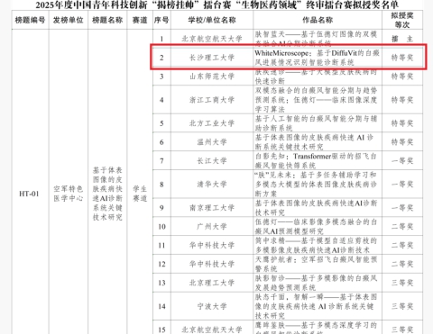 在近日落幕的2025年度中国青年科技创新“揭榜挂帅”擂台赛中,我院王新、王威老师带领的学生团队凭借“WhiteMicroscope:基于DiffuVit的白癜风进展情况识别智能诊断系统”,在清华大学、华中科技大学等全国顶尖高校组成的279支队伍中脱颖而出,成功斩获“生物医药领域”主擂台赛特等奖,这也是XK星空首次获得挑战杯“揭榜挂帅”赛道特等奖,以实际成果展现了学校创新人才培养的扎实成效。