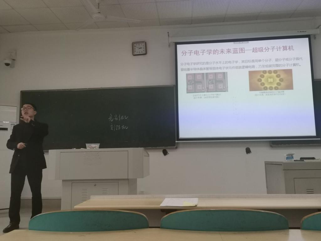 本次讲座的主题为《“小分子,大有可为”—分子电子器件的研究现状》,伍丹老师结合国产芯片“卡脖子”的难题,深入浅出从小分子的电学性质、分子电子器件的研究现状、分子电子器件领域有待探索和解决的问题三方面展开讲座。期间,他以“科学家的好奇心”为引,解释并分享了分子电子学的发展、超级分子计算机、分子材料、分子器件等方面的前沿知识。同时,结合自身科研经历,生动具体的介绍了初涉科研的基本方法,并强调信息检索与快速阅读理解能力的重要性,为初涉科研的同学们提供了新的思路。