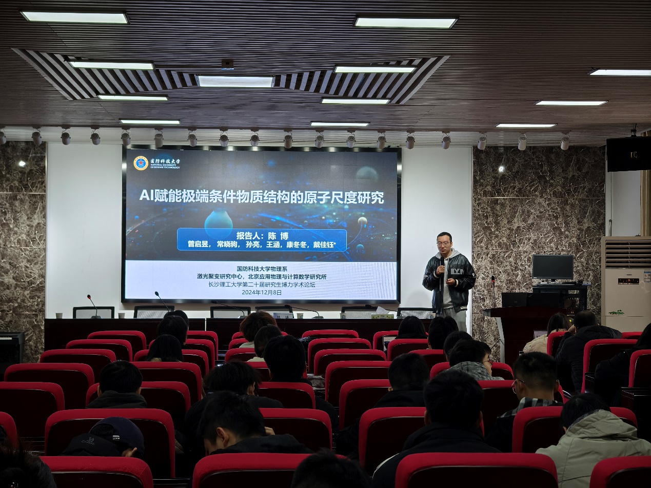 开幕式结束后,陈博教授首先作了题为“AI赋能极端条件物质结构的原子尺度研究”的专题报告。陈博副研究员通过融合人工智能与物理计算方法,将第一性原理精度计算扩展至百万原子量级,研究极端条件下物质结构相变的动态演变过程,为理解动态载荷下的相变过程提供了新的途径,也为极端条件下物质的科学探索开辟了新视角。