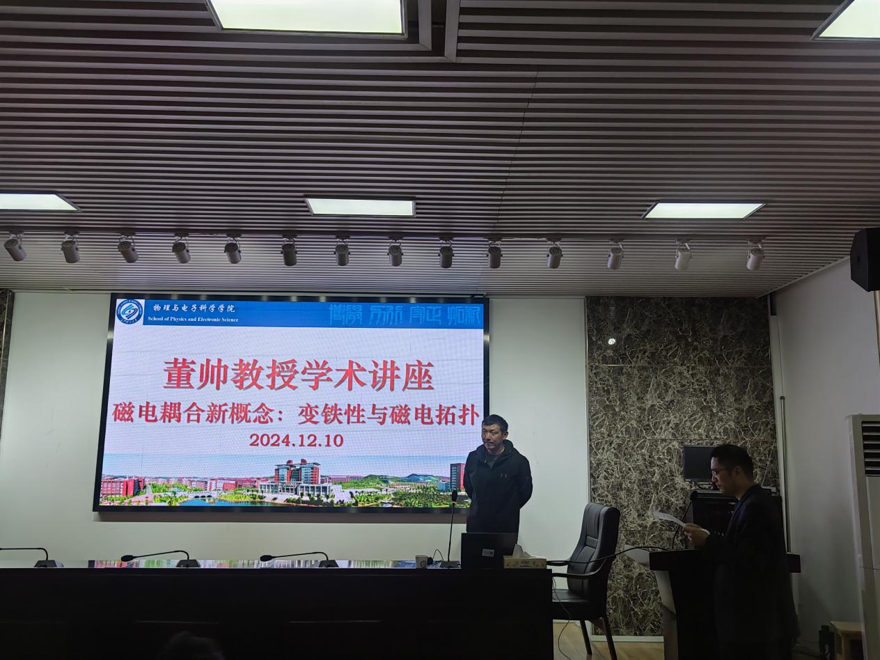 2024年12月10日上午,我院邀请了东南大学董帅教授来我院做了以《磁电耦合新概念:变铁性与磁电拓扑》为题的学术报告,会议在理科楼B413开展,由张卫兵教授主持,百余名师生参加。