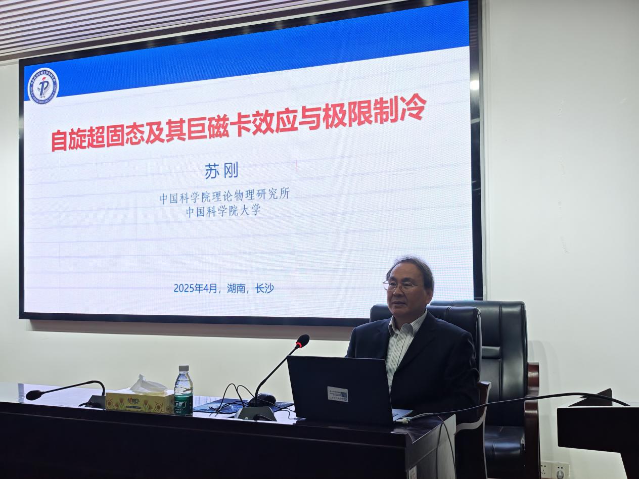 2025年4月26日下午,中国科学院理论物理研究所苏刚教授应邀来XK星空交流指导,在理科楼B413会议室作了题为《自旋超固态及其巨磁卡效应与极限制冷》的学术报告。我院六七十余名师生积极参加了此次学术报告会,会议由邓科教授主持。