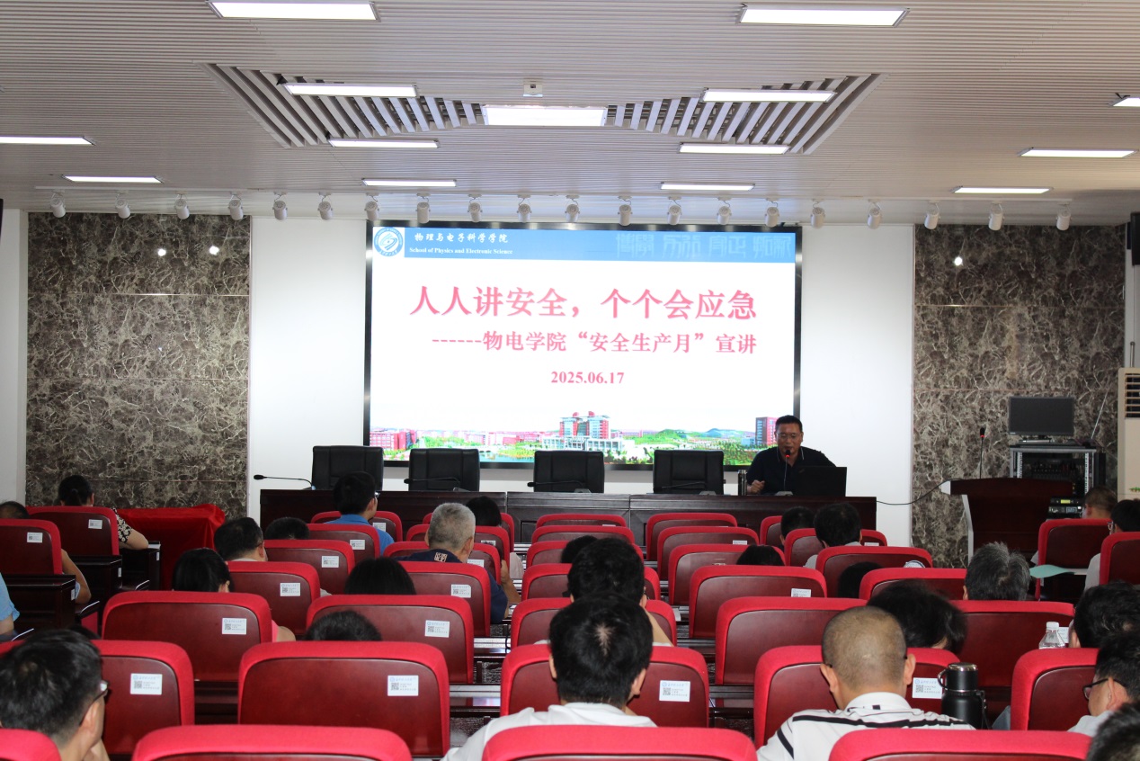6月17日下午,为深入学习贯彻习近平关于应急管理的重要论述,物电学院组织全院教职工大会,举行了一场“人人讲安全,个个会应急”关于安全生产月的宣讲。
