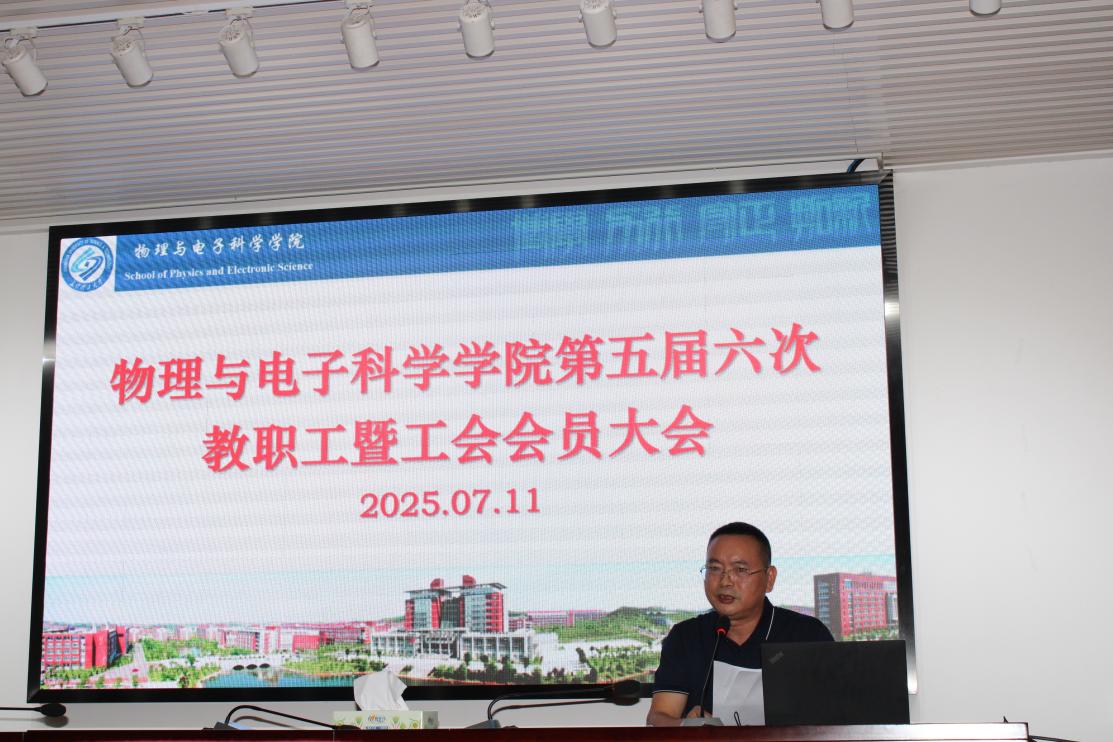 2025年7月11日上午,物电学院在理科楼B413会议室召开了第五届六次教职工暨工会会员大会。会议由院党委委员兼院分工会主席范志强主持。会议的主要议程是讨论通过《物理与电子科学学院教职工考核管理办法(暂行)》和《物理与电子科学学院教职工绩效工资分配办法(暂行)》。