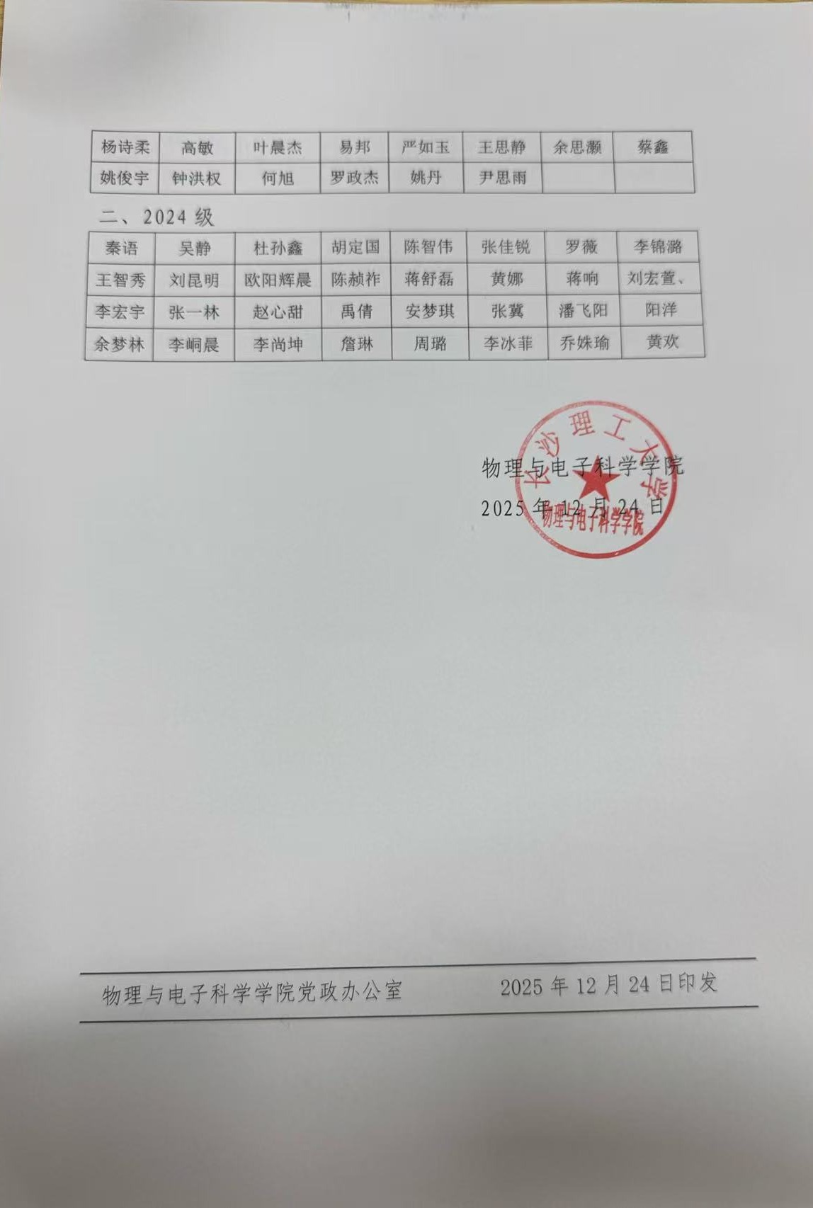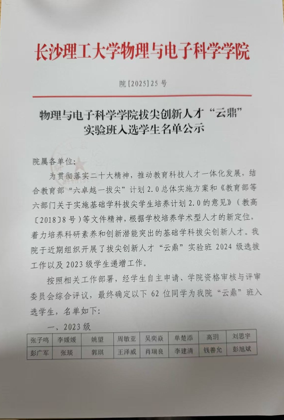 物理与电子科学学院拔尖创新人才 “云鼎”实验班入选学生名单公示