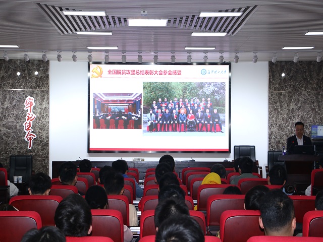 宋刘斌老师以“把驻村积累的精神财富化作奋发前行的动力”为题,分享了自己在全国脱贫攻坚表彰大会上的感受以及在枧甘村扶贫的经历。从成立党员志愿服务队,修建贵王桥和5组通护路,到投入资金建设易地扶贫搬迁安置点、动员全校师生“带货”帮售农产品……鲜活的案例、生动的图片让在场的同学仿佛亲历了山村的蜕变,也深切领会了打赢脱贫攻坚战的重大意义,更对党的政策、国家制度的优越先进性有了深刻的理解和认识。最后,宋老师寄语全体青年:“希望同学们能够在艰苦奋斗中坚定理想信念,在认真学习中练就过硬本领,在为民服务中发扬奉献精神,把科研论文写在祖国的大地上。”
