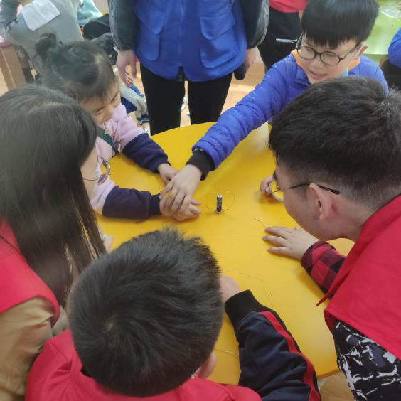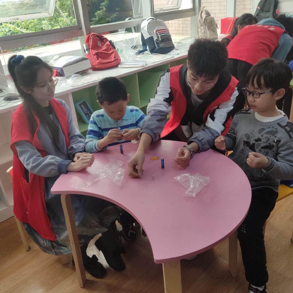 3月28日物电学院“小小科学家”团队进行了本学年第一次线下科普活动。本次活动共计10名志愿者参与,共有16名小朋友,分为四组,每组4人,今天实验主题为旋转的铜线圈,第一组的志愿者早早的就开始准备各种实验器材与活动场地。志愿者先为大家讲解了此次实验的目的,然后进行了实验操作示范,在操作过程中掺杂讲解让小朋友们更加理解操作步骤,然后引导小朋友手动完成实验,最后志愿者讲解了此次实验的实验原理。