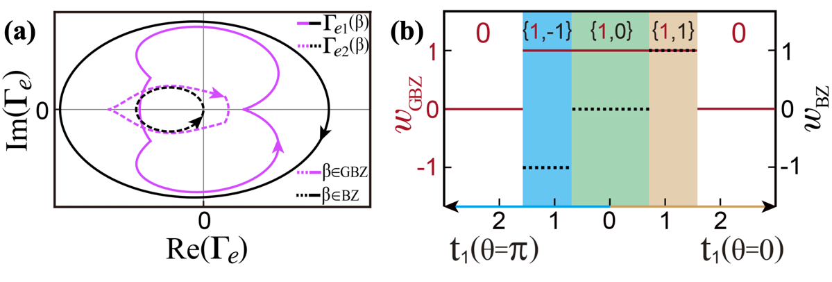 图2 (a)波矢随GBZ和BZ演化,(b)表征拓扑边缘态的拓扑元组。