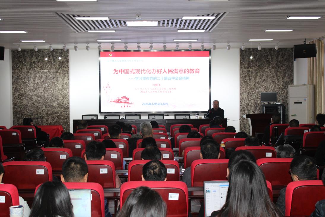 12月2日下午,物电学院党委理论学习中心组(扩大)在理科楼B413专题学习党的二十届四中全会精神。学院特邀马克思主义学院二级教授、湖南省人大财经工作咨询专家刘解龙专题解读党的二十届四中全会精神,以党课筑牢思想根基。学院全体教职工参会。会议由学院党委书记张国强主持。