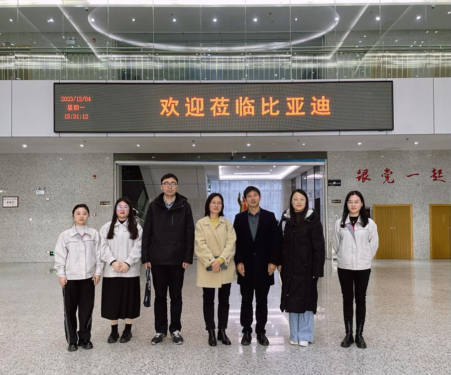 长沙市比亚迪汽车有限公司,物电学院、数统学院一行首先参观了比亚迪展厅,对公司的发展历程以及公司的科研情况有了深入了解,随后一行人参观了公司四大工艺生产车间,对电动汽车生产的全过程也有了全新认识,接着,在比亚迪会议室,双方进行了深入交流,宋国宁、郑忠辉分别介绍了各自学院情况,并结合学院的专业建设、科研平台、人才培养等,提出了与比亚迪公司在产学研合作、实习基地、就业基地等方面进一步加强合作的设想。比亚迪华中地区人力资源部招聘负责人罗雪介绍了公司发展历程、企业文化和理念、电动汽车技术研发和应用等情况,表达了加强产学研合作的愿望,也欢迎学生到公司实习和就业。