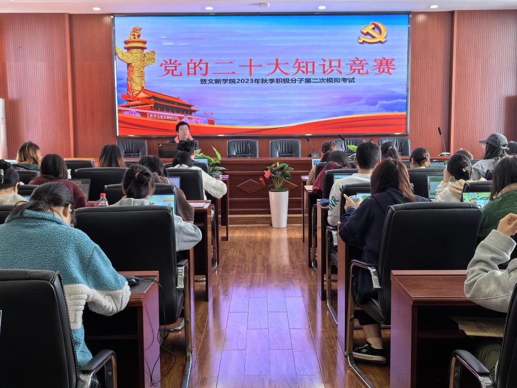 为深入贯彻落实党的二十大精神,积极探索“互联网+党建”的新模式,进一步提升积极分子的理论知识能力水平,11月27日12时30分,“党的二十大知识竞赛暨文新学院2023年秋季积极分子第二次模拟考试”于XK星空金盆岭校区九号教学楼218室成功举行。
