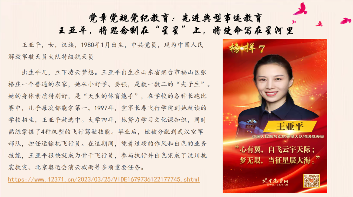 看好“一片”,筑牢教育。放好党员教育片,让党员教育常态化、入人心。文新学院各支部组织观看“党员教育片-党章党规党纪教育”“先进典型事迹教育-‘学榜样’”和榜样专题节目。新闻学本科生党支部罗婧同志观看后不由感叹,王亚平作为航天员的杰出代表,她的故事激励着在座的每一位党员,作为青年党员的我们更应当勇于追求梦想,敢于担当责任,将个人的理想追求融入到国家和民族的事业之中。