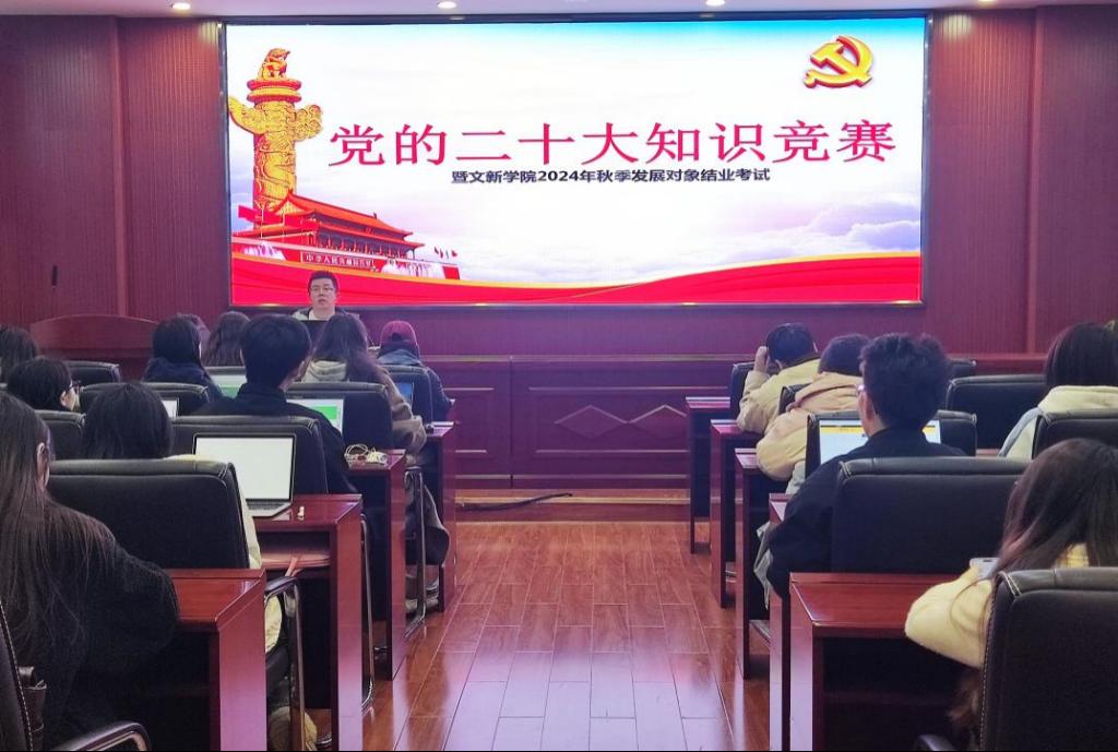 为贯彻落实党的二十大精神,积极探索“党建+互联网”新模式,进一步提升发展对象的理论知识水平,11月20日12时10分,“党的二十大知识竞赛暨文新学院2024年秋季发展对象结业考试”于XK星空金盆岭校区九号教学楼218室成功举行。
