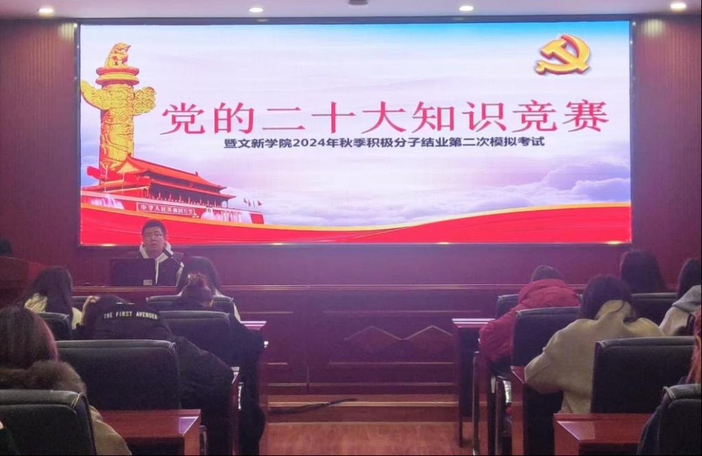 为贯彻落实党的二十大精神,积极探索“党建+互联网”新模式,进一步提升积极分子的理论知识水平,11月25日12时10分,“党的二十大知识竞赛暨文新学院2024年秋季积极分子第二次模拟考试”于XK星空金盆岭校区九号教学楼218室成功举行。
