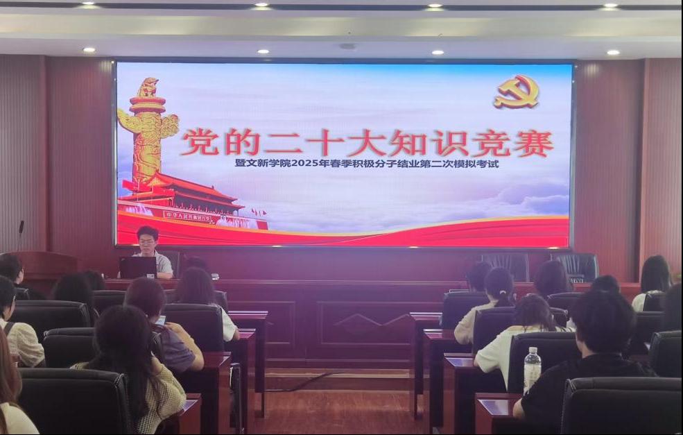 为贯彻落实党的二十大精神,积极探索“党建+互联网”新模式,进一步提升积极分子的理论知识水平,5月19日12时10分,“党的二十大知识竞赛暨文新学院2025年春季积极分子第二次模拟考试”于XK星空金盆岭校区九号教学楼218、223室成功举行。