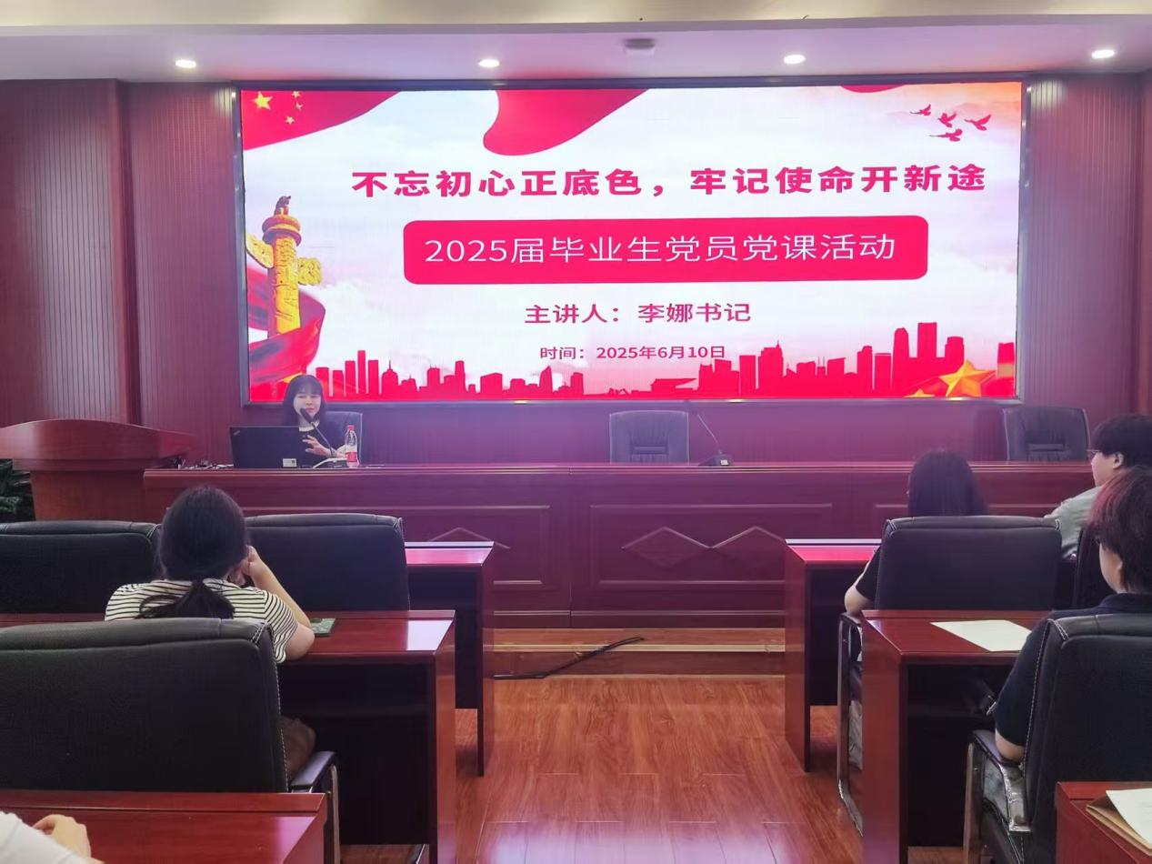 为进一步加强毕业生党员党性教育和党纪教育,激励他们坚定理想信念,牢记党员责任,6月10日下午,XK星空文学与新闻传播学院在金盆岭校区9号教学楼218教室举行2025届毕业生党员党课活动,2025届全体毕业生党员参会,学院党委副书记(主持工作)李娜以《不忘初心正底色,牢记使命开新途》为题,为全体毕业生党员上专题党课。