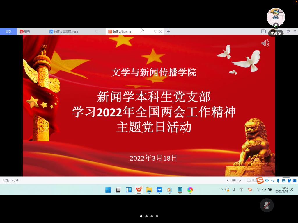 3月18日晚,我院新闻学本科生党支部线上组织开展3月份主题党日活动。本次活动由支部书记陈鑫宇同志主持,支部全体党员参加。