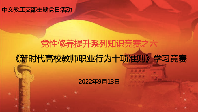 知识竞赛分男女党员教师两组,通过线上、线下抢答等方式,主题党日的活动更具趣味性,支部党员的学习热情被进一步调动起来。后续中文教工支部将进一步加强集体学习、互相交流,并将习近平总书记在《努力实现高水平科技自立自强》中提出的“我国教育是能够培养出大师来的,我们要有这个自信”精神贯彻到教学、科研工作中,努力为迎接党的二十大、奋进新征程做出自己的贡献。(文、图/侯承相 审/周云鹏)