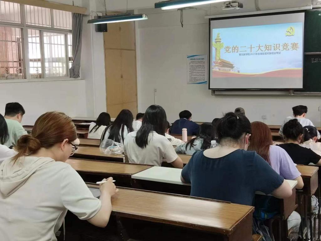 为深入落实并贯彻落实党的二十大精神,积极探索“互联网+党建”的新模式,进一步提升党员发展对象的理论知识能力水平,2023年6月6日13点30分,“党的二十大知识竞赛暨文新学院2023年春季发展对象结业考试”于XK星空金盆岭校区三号教学楼成功举行。