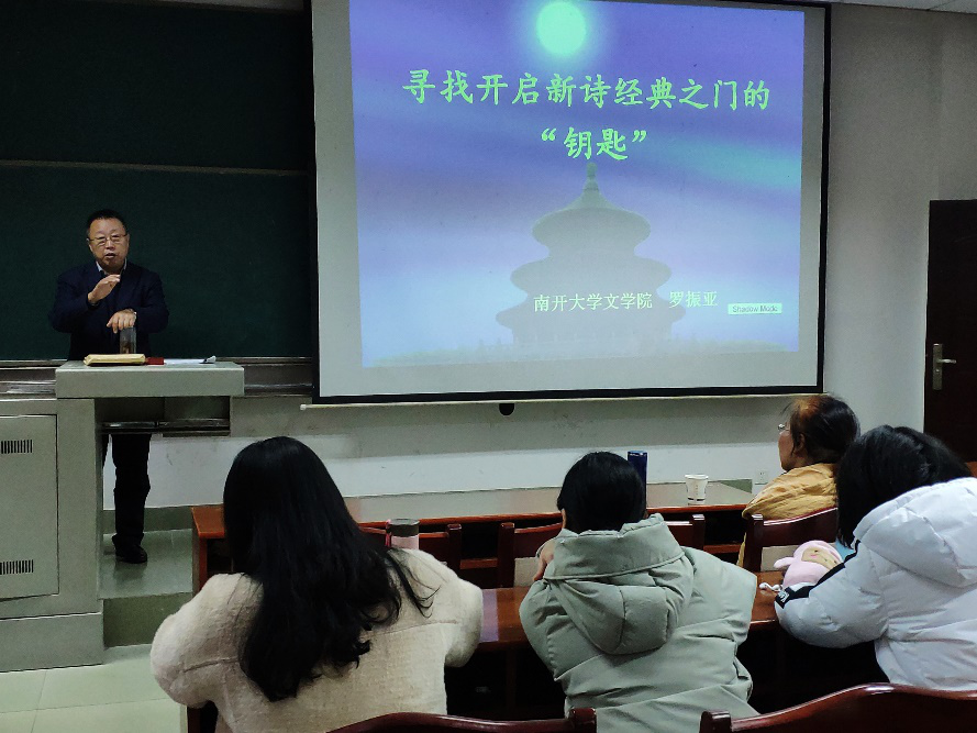 2019年12月6日下午,南开大学教授、博士生导师罗振亚应邀来到XK星空文学与新闻学系,在金盆岭校区7教110教室作了“寻找开启新诗经典之门的‘钥匙’”的专题讲座。本次讲座由易彬教授主持,文学与新闻学系的宁淑华、董外平等老师以及研究生、本科生,共计百余人参与聆听了此次讲座。