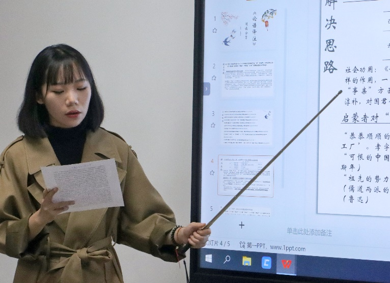 接着,中文班贺宇怡、张煜佳、段玥、谷艳怡、曹雨晴五名同学进行汇报分享。五名同学都针对《论语译注》这本主题书籍,拓展汇报了不同作品中的关键字词辨析,如《为政》中的“殆”字辨析、“游于艺”辨析、“孝”概念辨析等。
