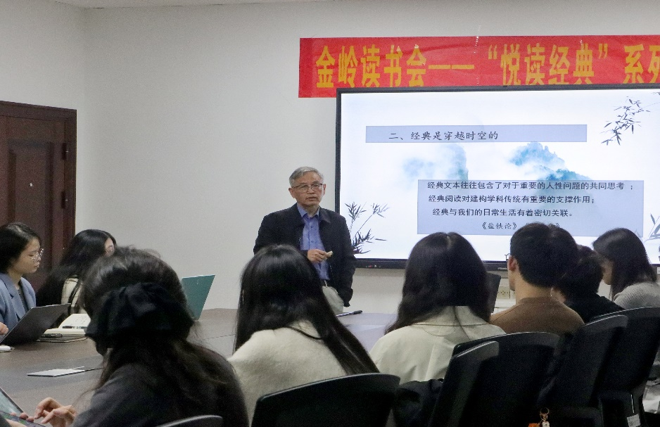 为全面提升我院研究生文学素养,培养研究生多读书、勤思考的良好习惯,10月29日晚,我院在9教318教室举办了以“经典阅读漫谈”为主题的第二期“悦读经典”金岭读书会。成松柳教授主讲,中文班班长盛雯妍主持,学院副院长戴钰、中文专业系主任侯承相,以及中文班全体研究生参加此次读书会。