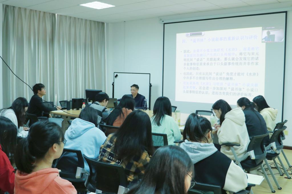 2022年10月8日上午9点,XK星空第十八届研究生博力学术论坛文新学院分论坛第三期于金盆岭校区7教306举行。广州大学人文学院纪德君教授为我院师生开展了主题为“口头传统规约下的小说叙事——以《水浒传》为中心”的讲座。此次讲座线上线下同步举行,引起了我院师生的广泛关注。文新学院党委委员郑劭荣教授担任讲座主持人,中文系华德柱副教授、王福雅副教授、周静副教授、王莉老师、向双霞老师等出席了本次讲座。22级中文研究生及22级汉语言文学本科生全体参与听讲。