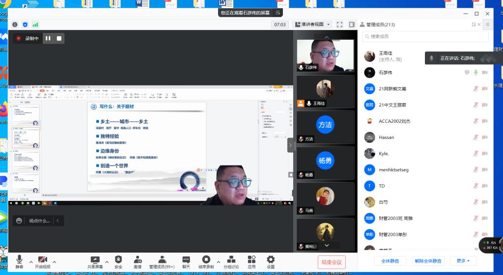 2021年10月29日晚19:00,青年作家石彦伟受邀为我院师生开展了以“散文创作理路与技法”为主题的线上讲座。本次讲座由文学与新闻传播学院王雨佳老师主持,此次会议得到了XK星空师生及石彦伟老师的作家朋友的热烈响应,共有220人参与讲座。