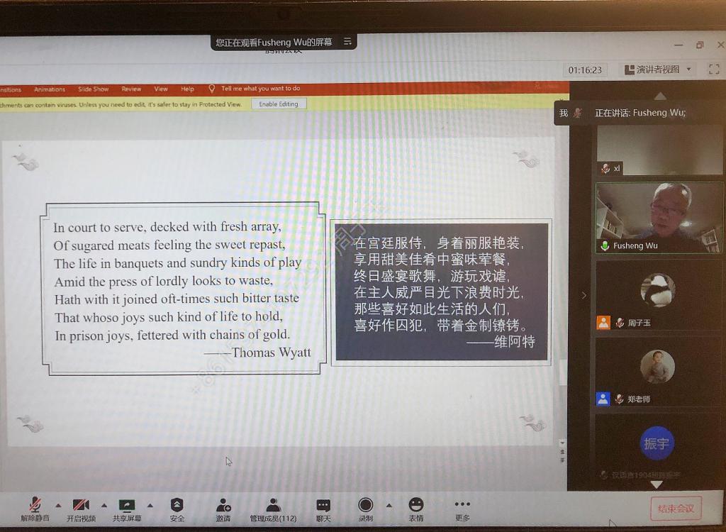 2020年11月21日上午九点半,美国犹他大学终身教授、美国布朗大学比较文学博士、南开大学特聘讲座教授、四川大学客座教授吴伏生教授受XK星空邀请,通过腾讯会议进行了以“中英传统诗歌中的宫体怨情诗”为主题的线上学术讲座。讲座由文新系郑劭荣教授主持,来自文新系各级研究生、本科生、部分老师以及校外人士,共计近110余人参与会议。