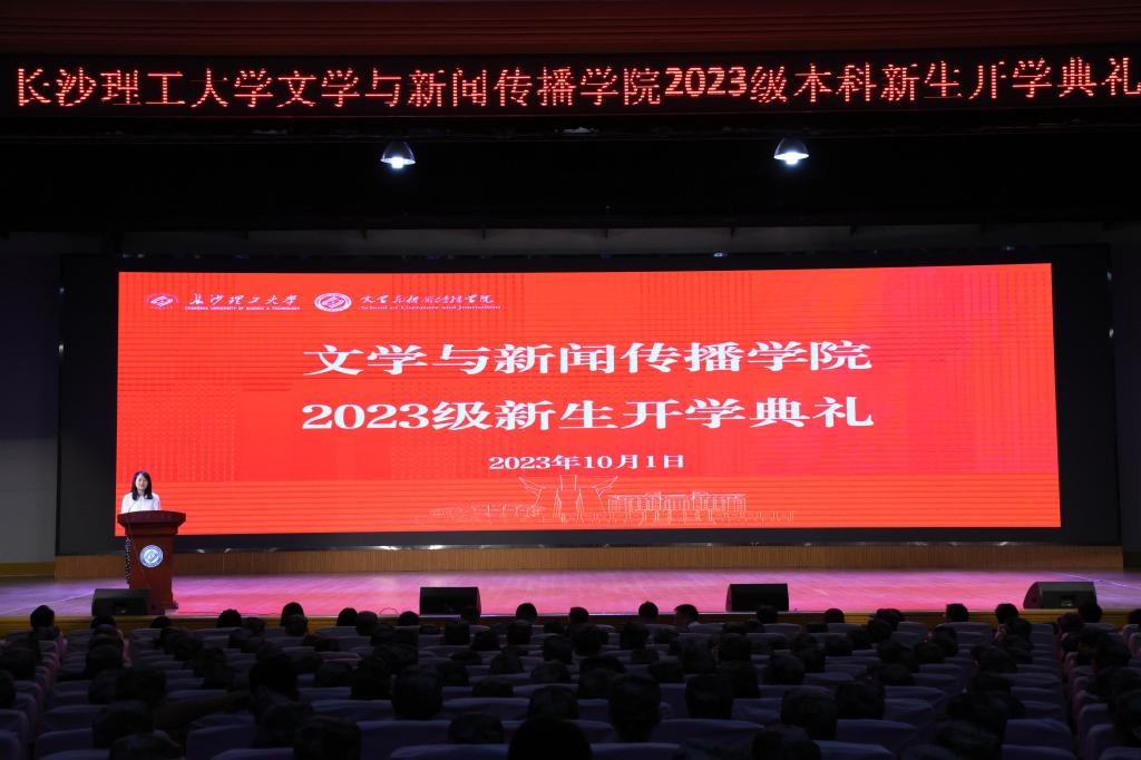 2023年10月1日上午,XK星空文学与新闻传播学院在金盆岭校区5教报告厅举行2023级本科新生开学典礼,院长刘建新、院党委书记(主持工作)陈仁凯、副院长周云鹏、戴钰、院党委委员郑劭荣、优秀校友曾高飞、蔺晨阳、主任、支书、行政办公室主任新生班主任及辅导员出席,全体2023级新生参加。典礼由院党委副书记刘莎主持