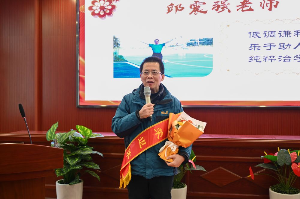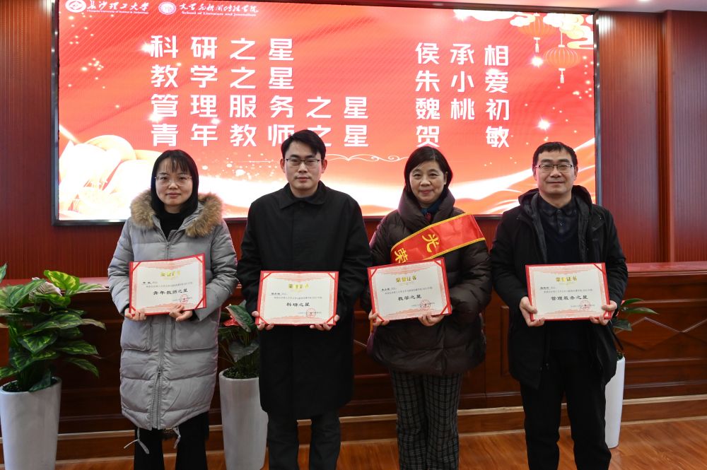 会议第二阶段,举行了教师荣休及年度突出贡献奖表彰仪式。侯承相、朱小爱、魏桃初、贺敏4名教师分获科研、教学、管理服务、青年教师之星。
