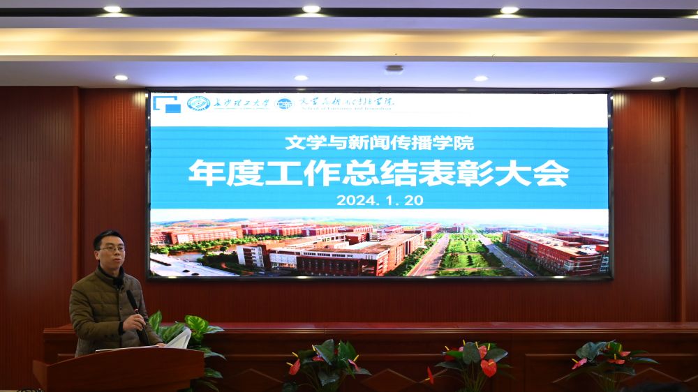 院长刘建新做2023年度学院工作报告,他全面总结了学院重点工作任务完成情况,以及师资队伍建设、人才培养、科学研究、学科竞赛等方面获得的成绩。他指出,过去的一年中,学院搬迁新址,办学环境有了质的提升,各方面工作整体进步明显,科研平台建设、师生典型培育、学术活动等方面均取得突破。学院全面落实了校内巡察整改任务,顺利完成本科教育教学审核评估,首次获批湖南省哲学社会科学重点研究基地,新闻与传播专业学位授权点顺利通过国家专项核验,国家社科基金、省部级课题立项数及智库成果继续呈现良好发展势头……这一切成绩的取得都是全院教职工共同努力、共同奋斗的结果。他提出了学院下一阶段发展的思路与目标,强调要以国际中文教育、戏剧与影视学位点及新一轮国家社科基金的申报等为重点工作,力争取得更大突破。