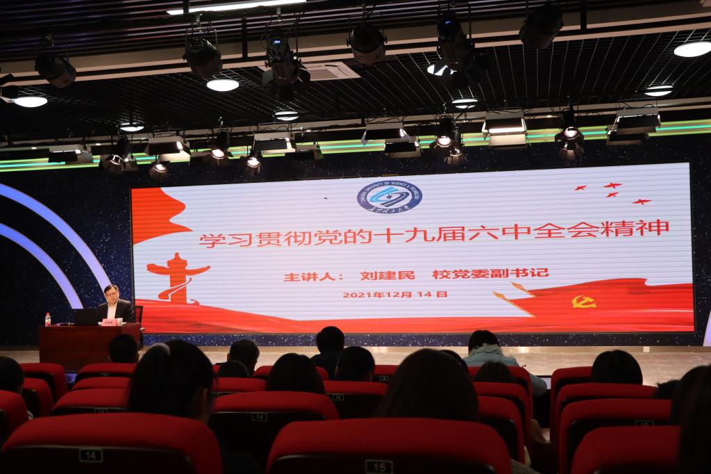 报告中,刘建民分别从六中全会召开的时代背景,《中共中央关于党的百年奋斗重大成就和历史经验的决议》的主要内容和精髓要义,十个坚持对高等教育的启示,XK星空如何贯彻落实党的十九届六中全会精神四个方面,对六中全会精神作了全面而深入的阐释。他指出,六中全会全面总结了党的百年奋斗重大成就和历史经验的重大意义,深刻阐明了以史为鉴、开创未来的重要要求以及从党的百年奋斗历程中汲取智慧和力量的重要任务。出台第三个历史《决议》是郑重的历史性、战略性决策,《决议》深刻揭示了我们党“过去为什么成功、未来怎样才能继续成功”这把“金钥匙”,阐明了深刻把握“一个牢记”的根本问题、“两个确立”的决定性意义、“三次飞跃”的理论成果、“四个时期”的伟大成就、“五个方面”的历史意义、“十个坚持”的历史经验。湖南第十二次党代会确立了全面建设社会主义现代化新湖南的奋斗目标,描绘了新湖南的宏伟蓝图,催人奋进、鼓舞人心。在分析“十个坚持对高等教育的启示”时,刘建民指出,高校要从“十个坚持”中汲取历史担当的力量,要更加坚定“四个自信”和“两个维护”,要更加坚定笃行新时代新格局新战略,要更加坚定学思践悟习近平新时代中国特色社会主义思想,要锤炼政治判断力、政治领悟力、政治执行力,要强化历史担当,强化责任意识,优化内部治理结构、全面提升治理能力,提振奋斗精神,为推进学校“百强”大学建设做贡献。最后,刘建民结合会议精神和学校发展实际,提出了XK星空贯彻落实党的十九届六中全会精神的具体举措,号召大家共同努力,为构建笃信长理、先锋长理、清廉长理、担当长理、幸福长理而奋斗。刘建民教授以其精准而深入的解读,客观而细致的思考,生动而精彩的报告,深深吸引了在场的所有师生。伍接朝在总结讲话时指出,刘建民副书记的专题辅导报告深入浅出,能从理论高度对《决议》作出通俗易懂、全面而深刻的解读。全体师生在聆听报告后,一定会坚定信心和信念,牢固做到“两个维护”。全体党员要把学习贯彻党的十九届六中全会精神作为当前首要政治任务,结合党史学习教育,在全院上下掀起学习热潮,学深悟透全会精神,从党的百年奋斗的重大成就和历史经验中汲取奋进力量,进一步提振迈向新征程、奋进新时代的“精气神”。(文/隆湘平、黄文雪、雷卓颖,图/林芷雯、王若渊,审/伍接朝)