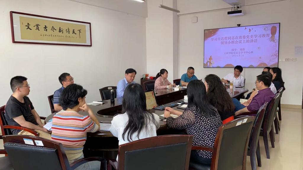 531日上午,文新学院党总支学习中心组成员在文科楼B505会议室举行专题学习会议,学院党总支书记伍接朝主持学习研讨,副书记刘莎传达学习了许达哲同志在省委党史学习教育领导小组会议上的讲话精神,学院行政党支部全体党员参加学习会议。