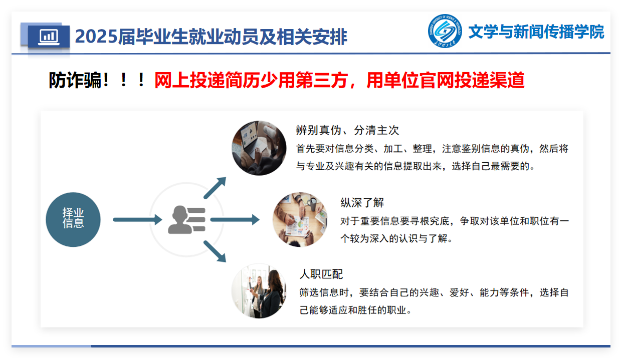 接着,陈鑫宇针对2025届就业形势做了分析,介绍了相关企业及招聘活动,求职注意事项,简历制作和面试技巧,2025届毕业生应届生身份与社保问题,云就业平台推荐表的填写、就业协议书签订注意事项等问题进行详细介绍,并结合自身求职经历做了分享,提振就业信心,鼓励毕业生们积极投递简历,参加招聘会,与用人单位进行有效沟通,以展现自己的才华和潜力;同时也对就业中可能存在的诈骗问题进行提醒,使同学们明确了就业目标、择业方法,以及如何规避就业中存在的风险等问题,为毕业生们提供了实用的就业指导和建议。