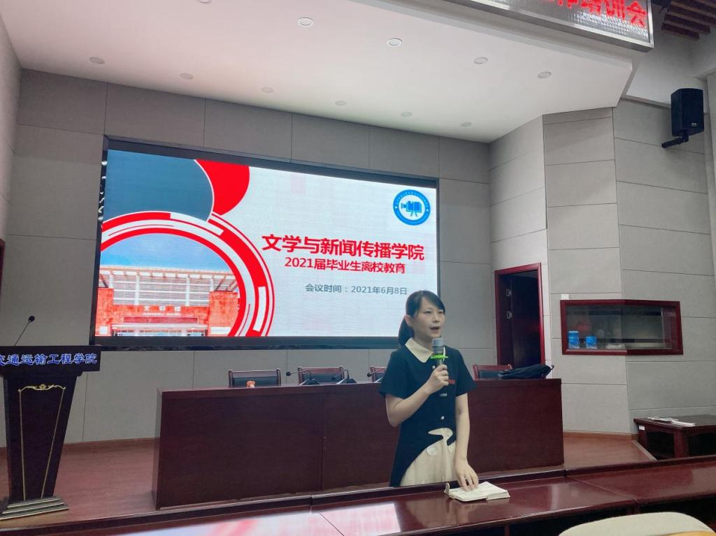 2021年6月8日晚,文学与新闻传播学院在XK星空云塘校区工二B310开展了2021届毕业生离校教育主题教育。本次主题教育由2017级辅导员陈鑫宇主持,文新学院党委副书记刘莎、文新学院学工办主任楚艳鸽出席本次会议。