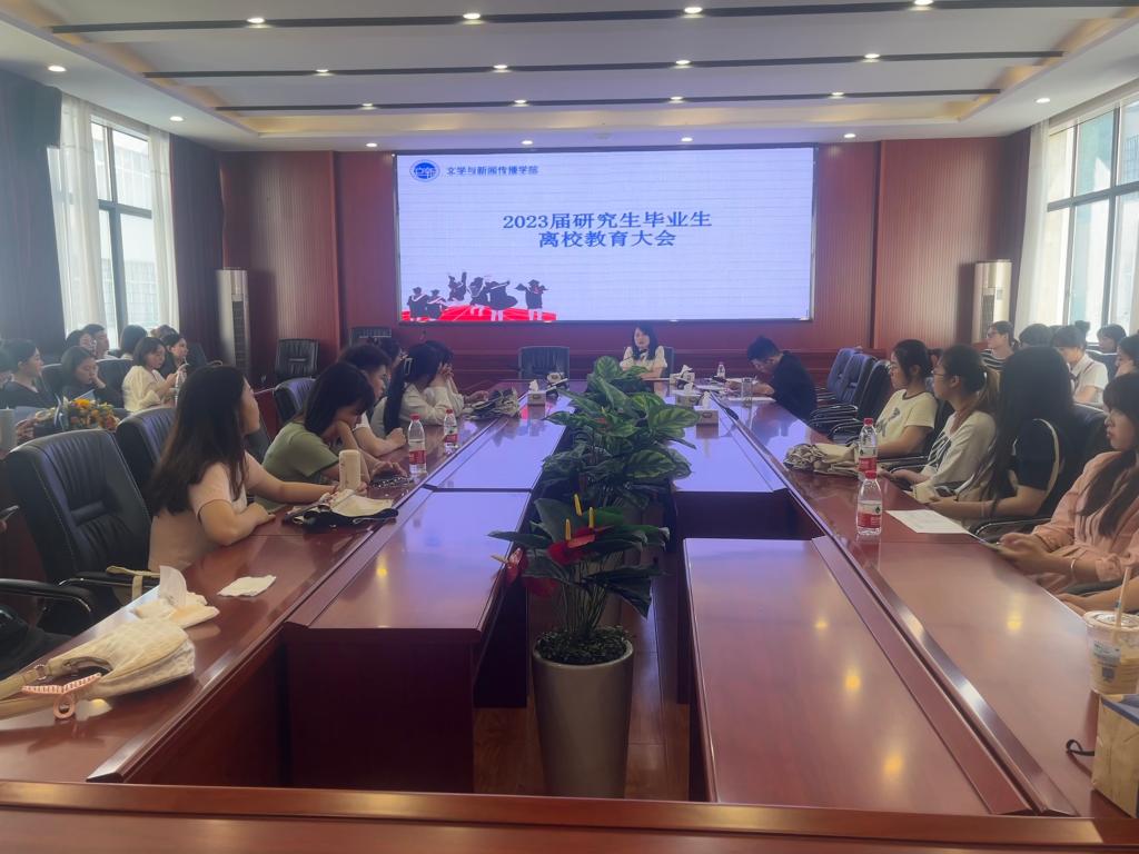 2023年6月5日,为更好保障2023届研究生毕业生顺利离校,落实好研究生毕业离校工作,文学与新闻传播学院在金盆岭校区9教218会议室召开了“研究生毕业离校教育大会”,会议由学院党委副书记刘莎主持,辅导员陈鑫宇、李婵、吴笛及23届毕业生参加。