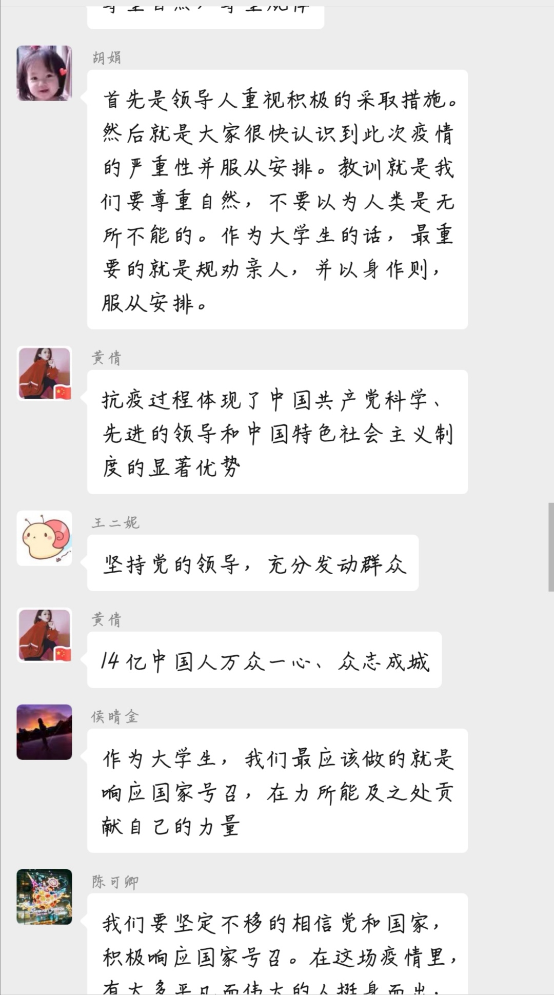 最后,就大学生在这次疫情中扮演什么样的角色、承担什么样的责任这些问题,大家在线讨论积极发言,听从党中央的统一指挥统一部署,杜绝粗陋的餐饮习惯,不吃野味等得到同学们的广泛认同。在举国上下万众一心,众志成城做好新冠肺炎疫情防控工作的特殊时刻,文新系学子要积极响应党中央和政府的号召,始终有着一定打赢疫情防控人民战争、总体战、阻击战的信心和决心,以防疫抗疫一线的感人故事为榜样,传承和弘扬爱国主义精神,胸怀大志、心有大我、肩负大义的时代召唤,不负韶华。