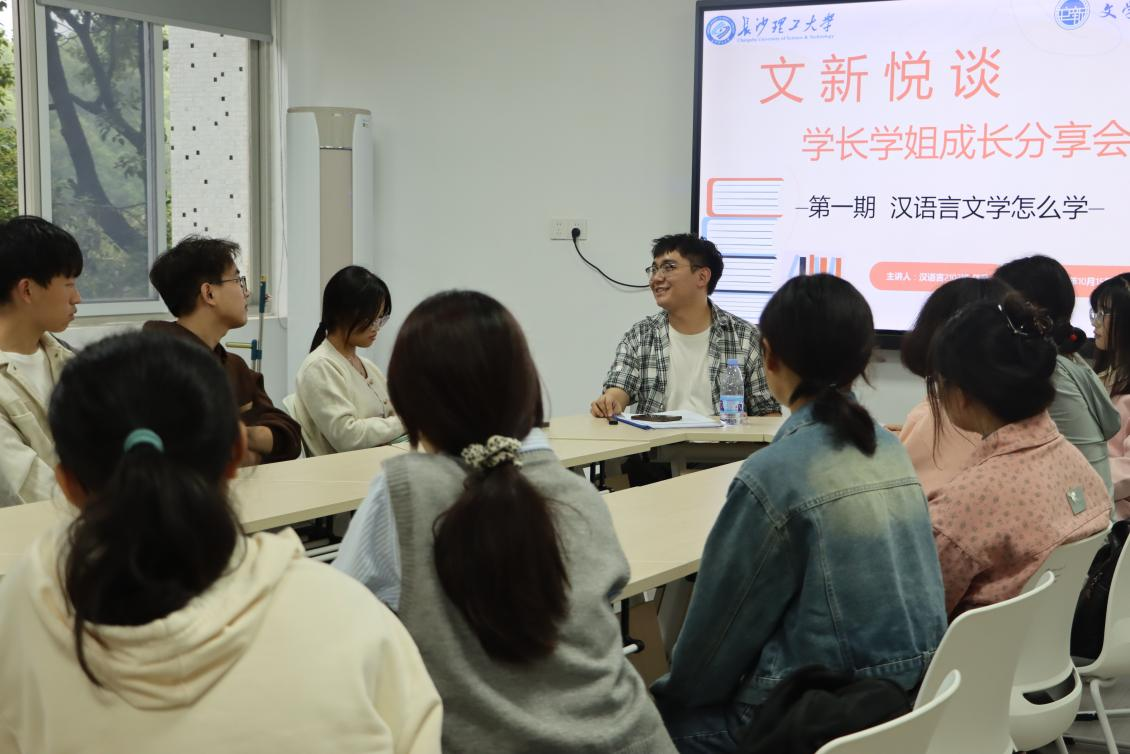 2024年10月15日,我院于金盆岭校区九教223团体心理辅导室举办第一期“文新悦谈·学长学姐成长分享会”汉语言2103班任源担任分享嘉宾,24级部分学生代表参与。